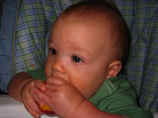 Tonight I gave him pureed carrots and peas, with some of the roast chicken that Jeff picked up from Costco today. I gave him half of an english muffin and some steamed peas, carrots and beans. I had to feed him his carrot/pea/concoction but the rest of it he fed himself. He loved it. From beginning to end.